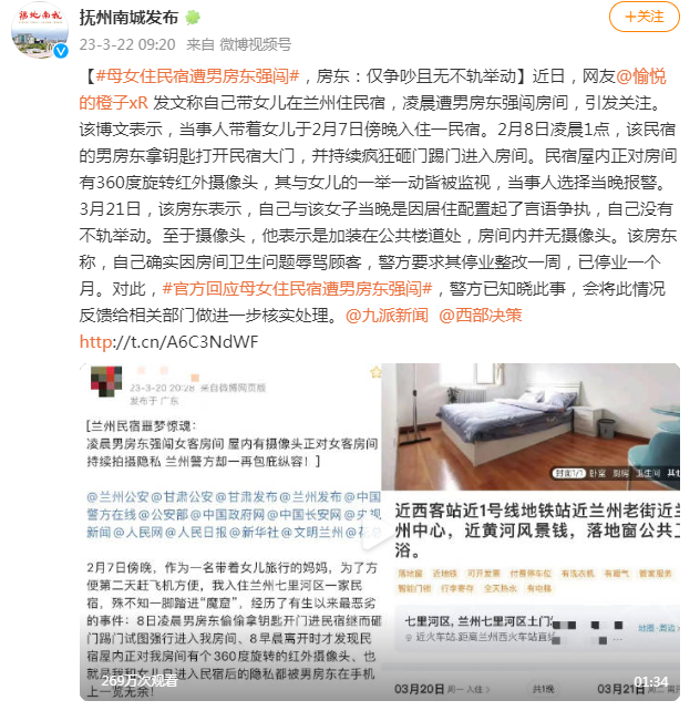 近日,网友@愉悦的橙子xR发文称自己带女儿在兰州住民宿,凌晨遭男房东强闯房间,引发关注。该博文表示,当事人带着女儿于2月7日傍晚入住