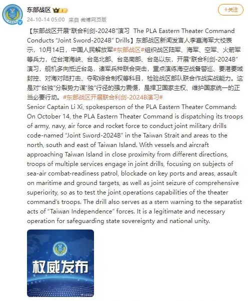 东部战区新闻发言人李熹海军大校表示,10月14日,中国人民解放军东部战区组织战区陆军、海军、空军、火箭军等兵力,位台湾海峡、台岛北