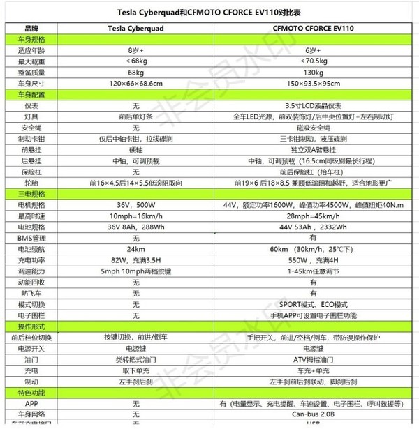 通过简单的参数对比之后,其实很容易能够看出来,春风的CFORCE EV110在性能,科技和配置方面有着碾压般的优势,特斯拉的Cyberquad更像是一台玩具而且价格昂贵,虽然特斯拉在电动汽车领域是霸主级别的存在,但是在全球的ATV市场,春风的影响力更大。