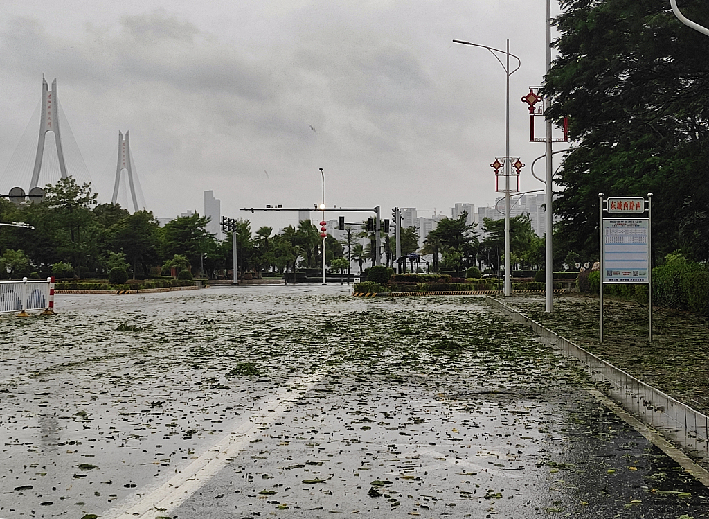 2023年7月17日傍晚,广东湛江,台风“泰利”即将登陆,风大雨大,残枝树叶掉落一地。