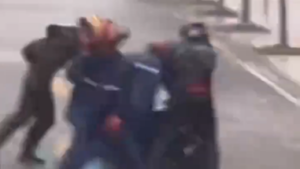 7月17日下午,广东阳江,台风“泰利”来临前夕,消防员出警清理路障归队途中,偶遇一市民骑摩托被台风刮倒。风力强劲,消防员在顶风中推行,他们被强风吹到模糊。视频来源:@中国消防 (00:14)